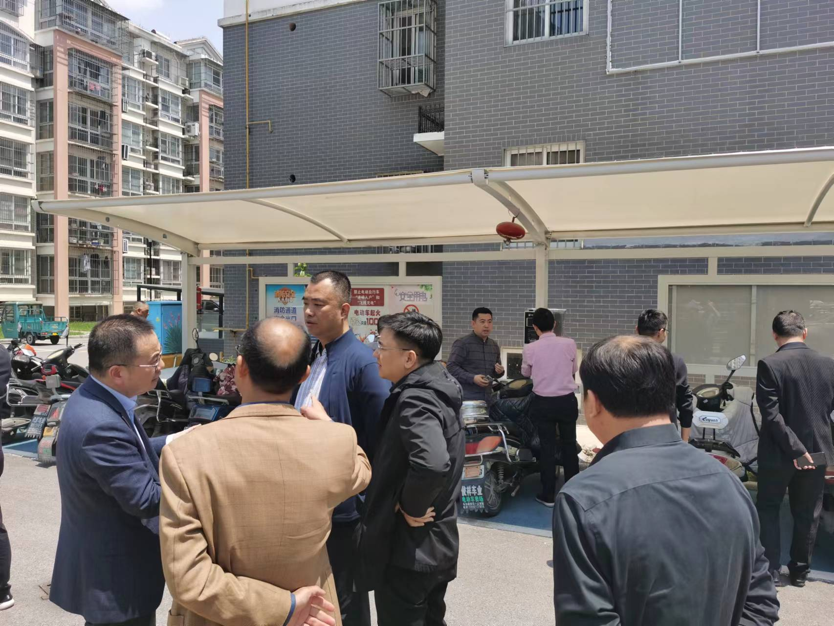 随后,与会各方到碧水嘉苑小区,现场察看了雨棚式充电桩和立柱式充电桩的建设及运营情况,并就安装选址、充电设备、消防设施等进一步交流。